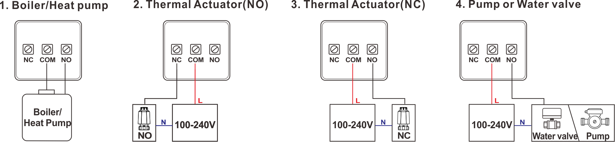 | Model No. | Heating | Cooling | Wired | Wireless | Programmable | Relay | Link with boiler | External Sensor | RF | WIFI | Power | Manual |