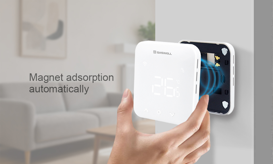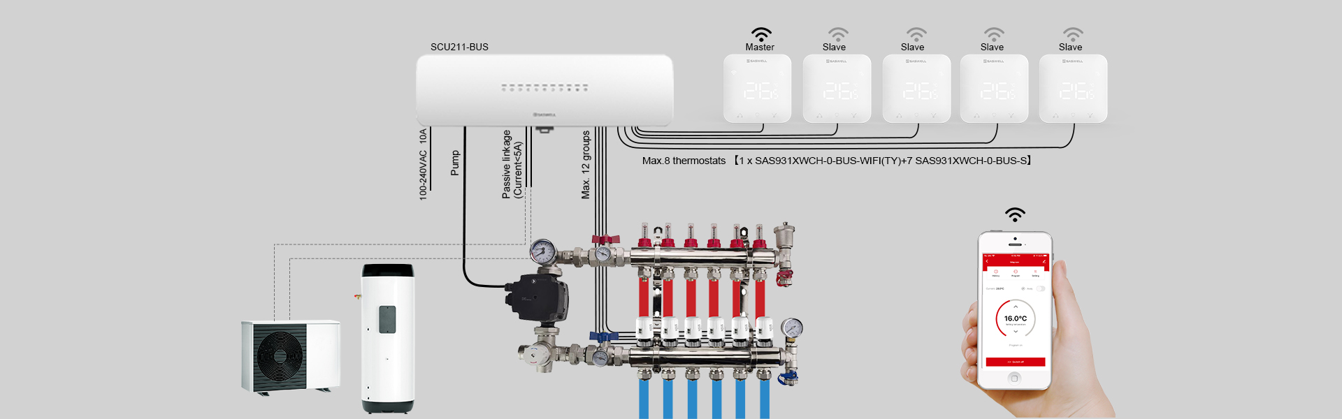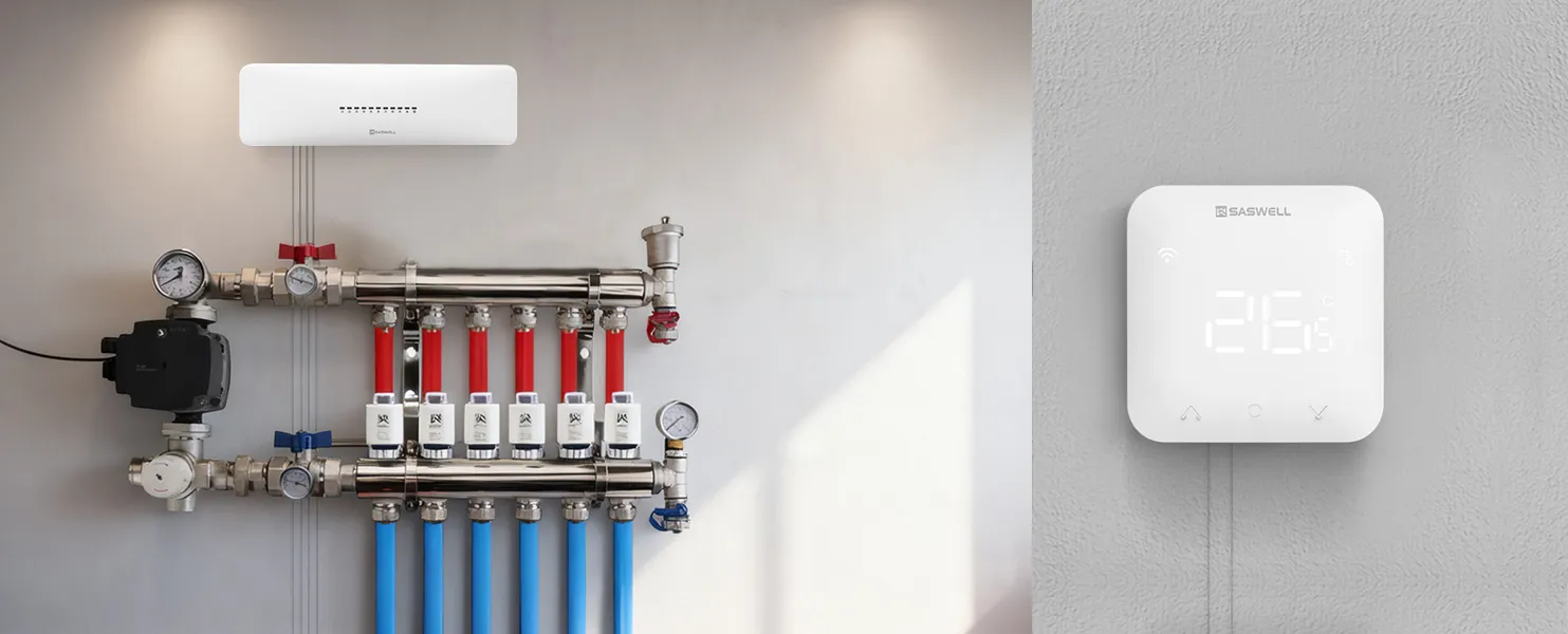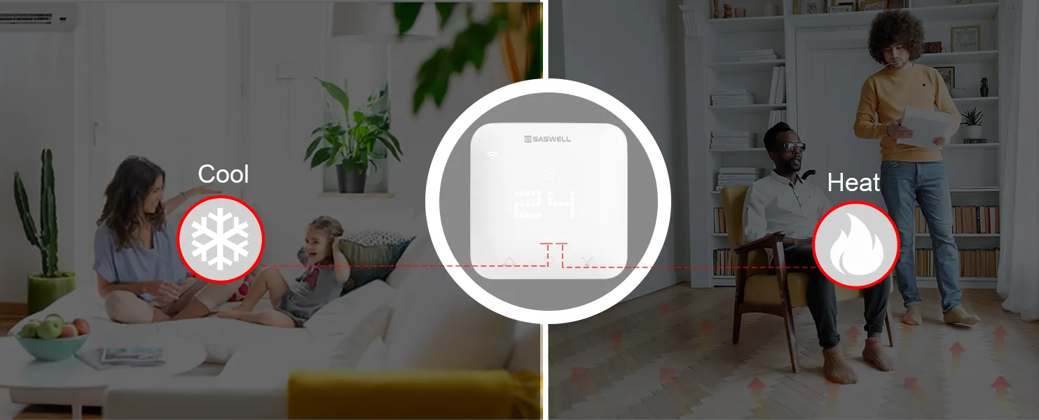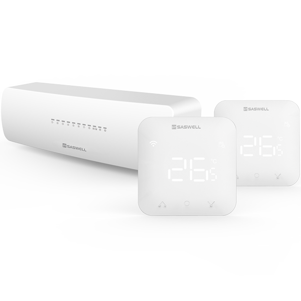 Water underfloor heating thermostat with heat pump control SAS931X. Auto, cool and heat mode suitable for heat pump system.