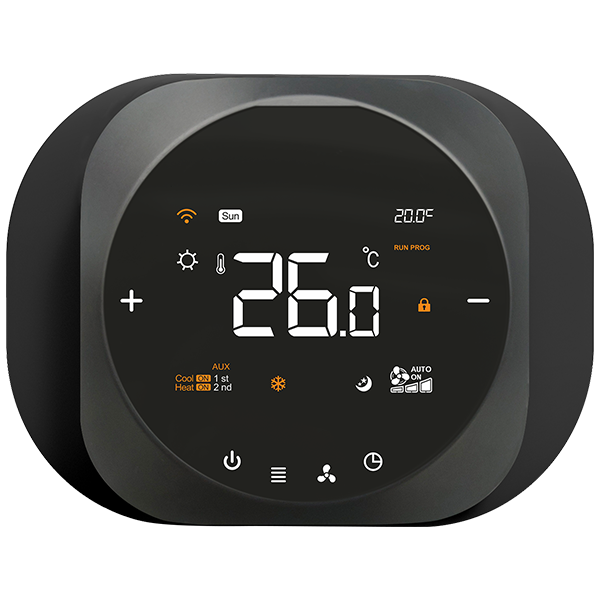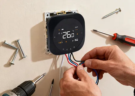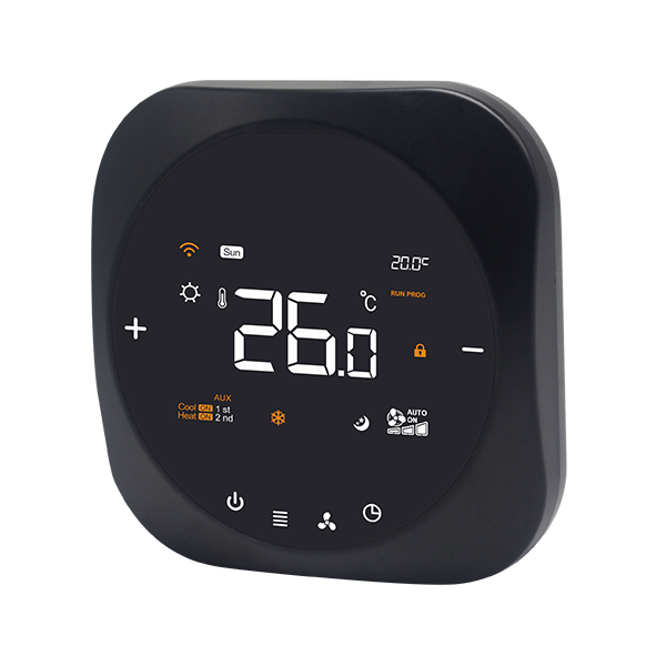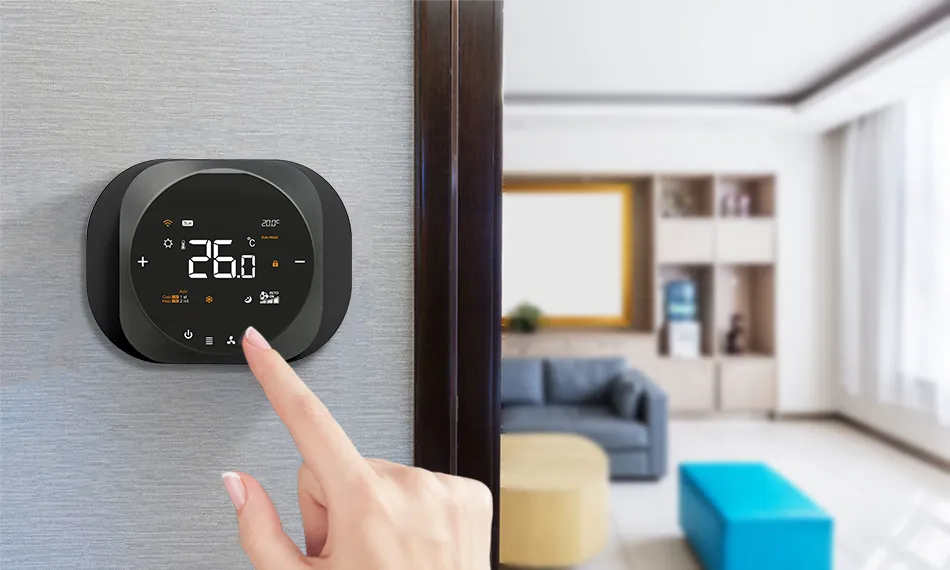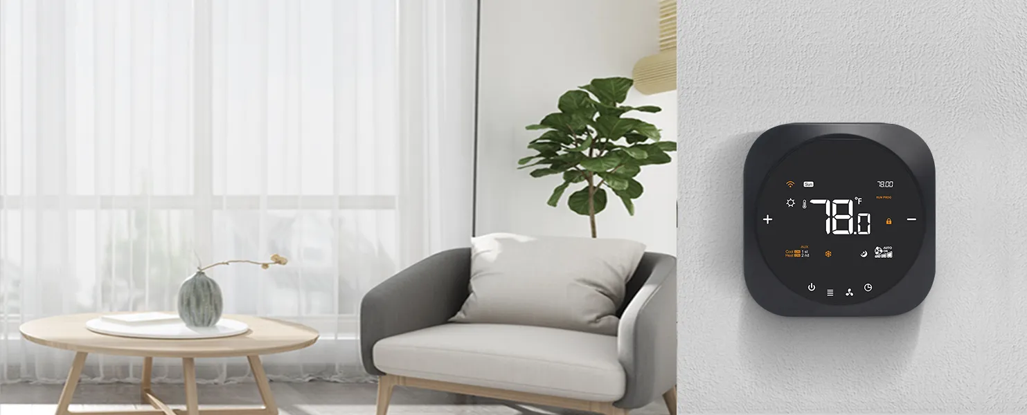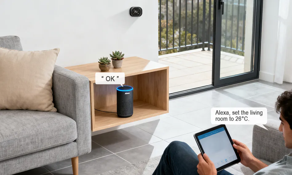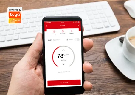 Tuya Smart Thermostat T18XUTW with built-in Alexa and Google Assistant voice control. It supports 4H/2C multi-stage temperature control, APP remote management, and Geofencing for energy savings.