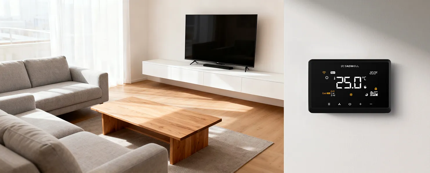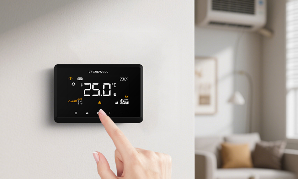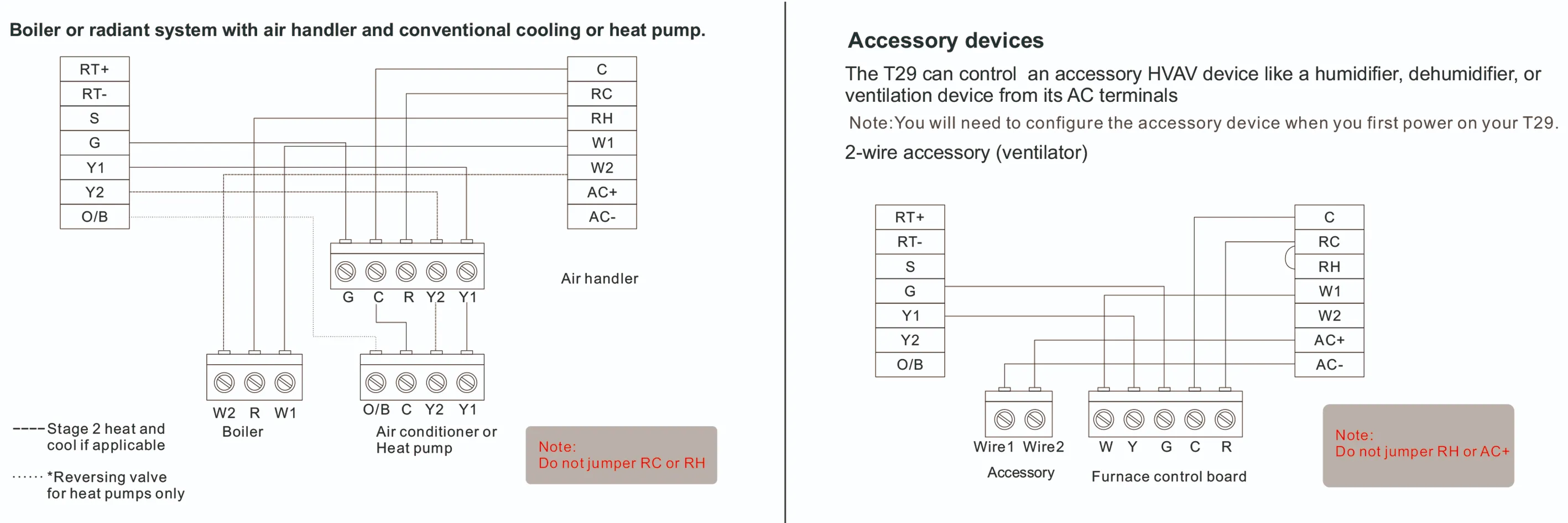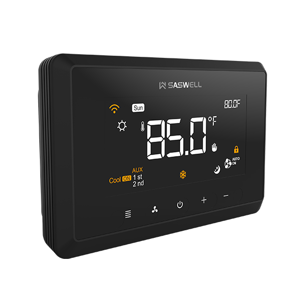 T29 designed for Fan Coil and DX systems. Features 3-speed fan control, 7-day programming, touchscreen, and 100-240V wide voltage compatibility.
