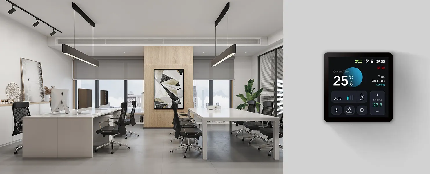 This series of Brushless DC (EC) Fan Coil Unit Thermostats is primarily used in high-end commercial buildings, 5-star hotels, top-tier hospitals, and luxury residences—environments demanding high energy efficiency, low noise, and maximum comfort in their EC FCU systems. Whether your system uses a PI proportional valve for precise water temperature control in variable flow FCU systems or an On/Off valve in conventional EC fan coil units, our solutions provide high-precision control. This series is the core product for upgrading FCU systems toward energy efficiency.