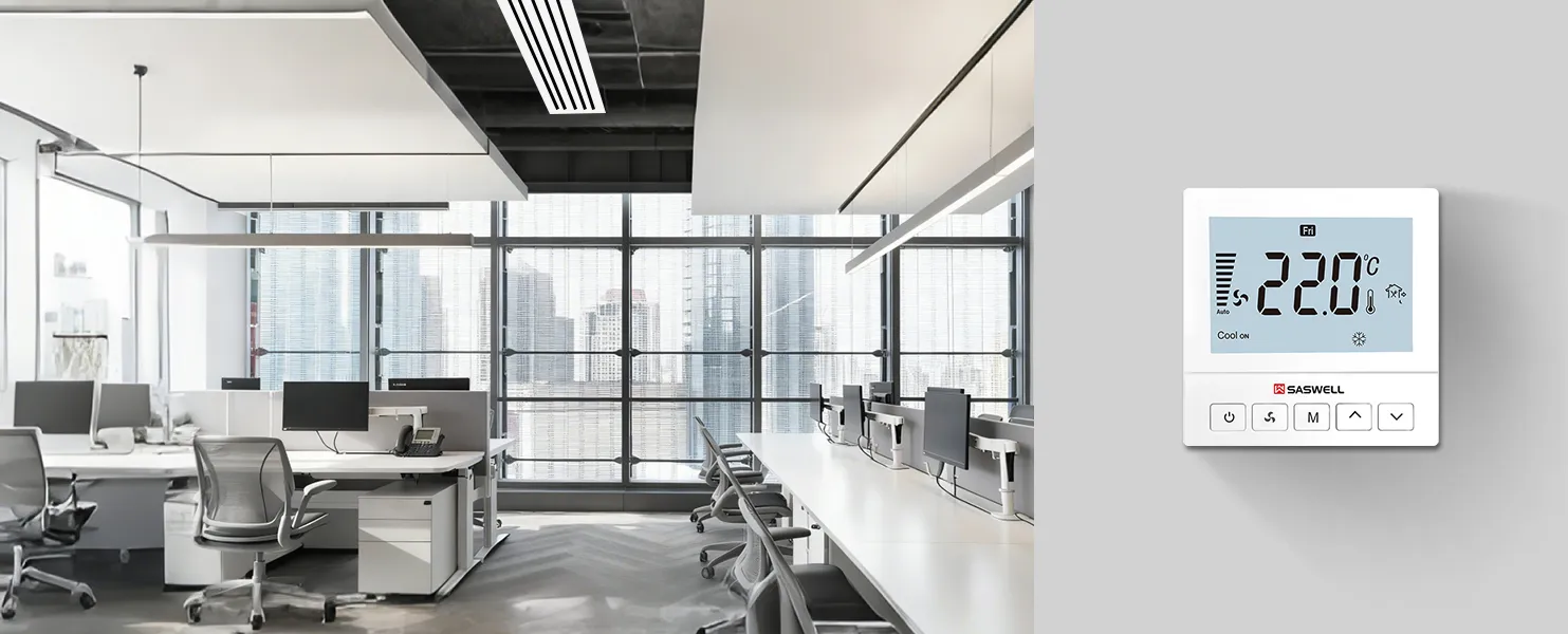 The SAS920FCT Series is a modern, wall-mounted fan coil unit (FCU) thermostat designed for both residential and commercial applications. It features a large LCD with a clear backlight and provides robust control over heating and cooling functions.