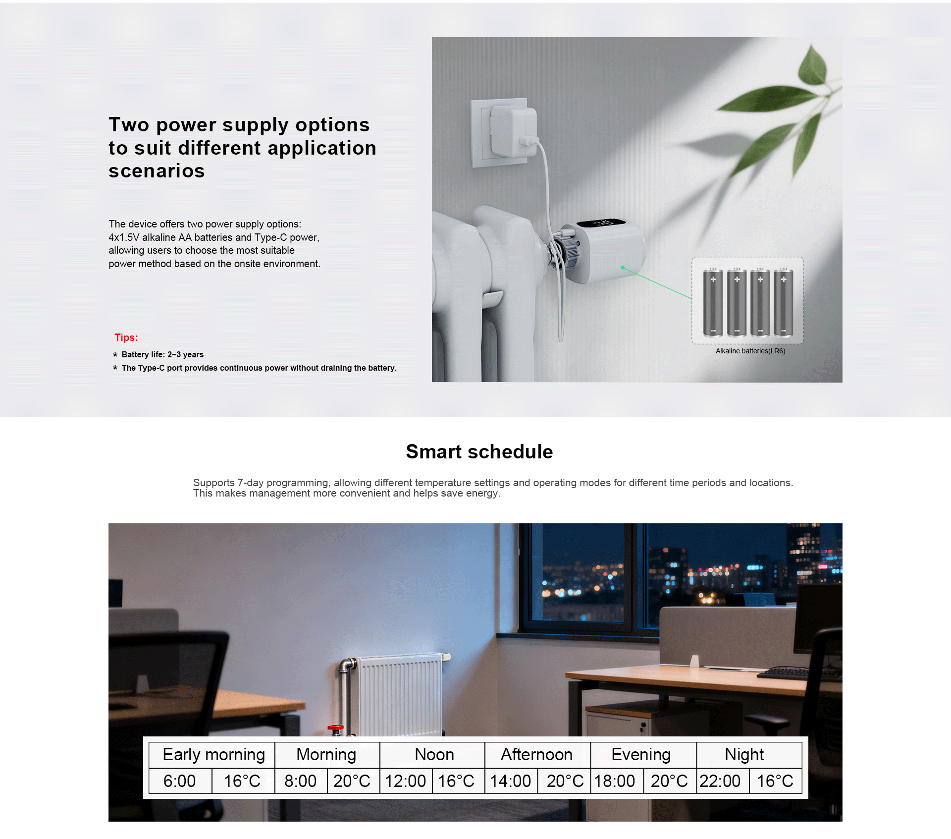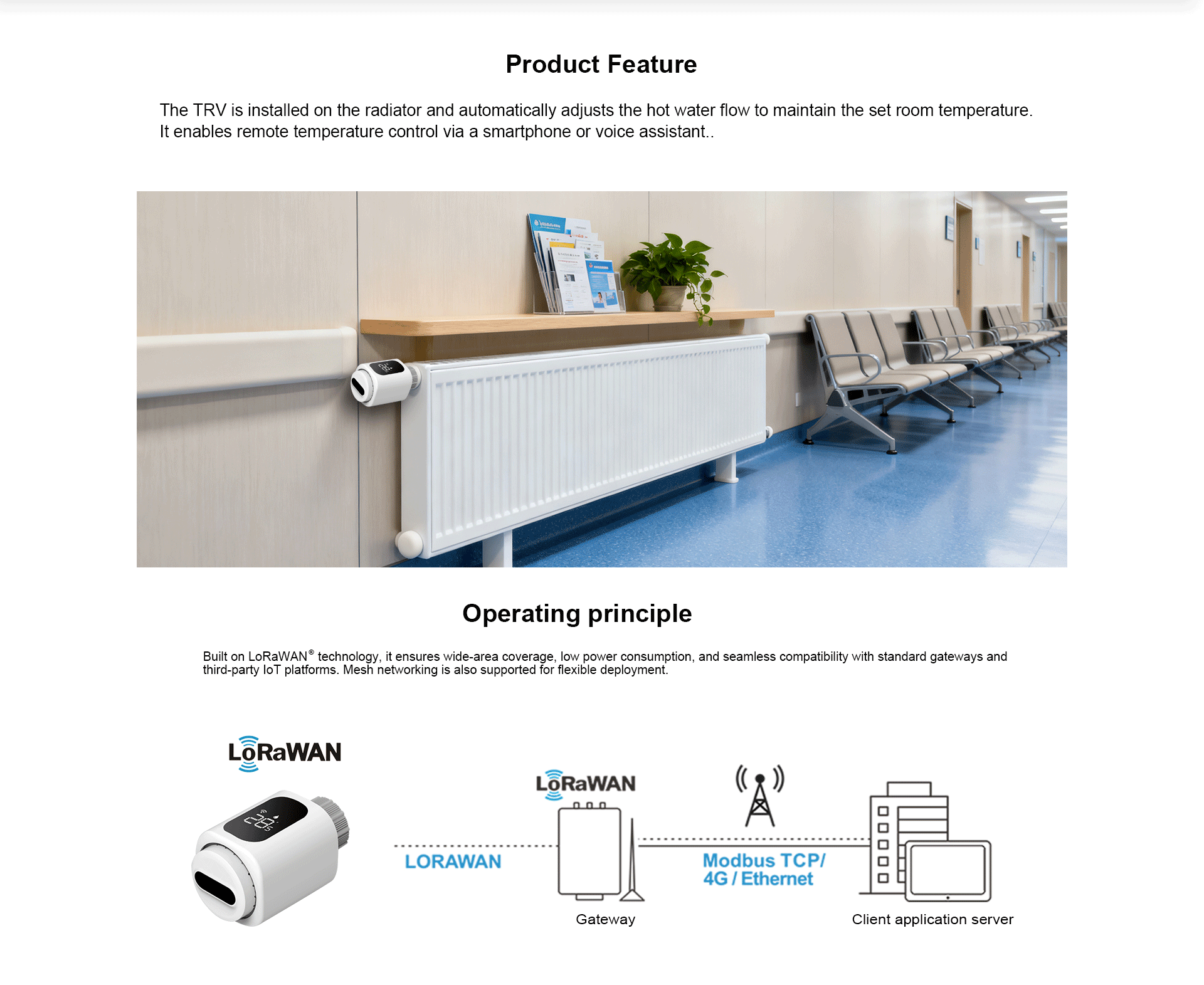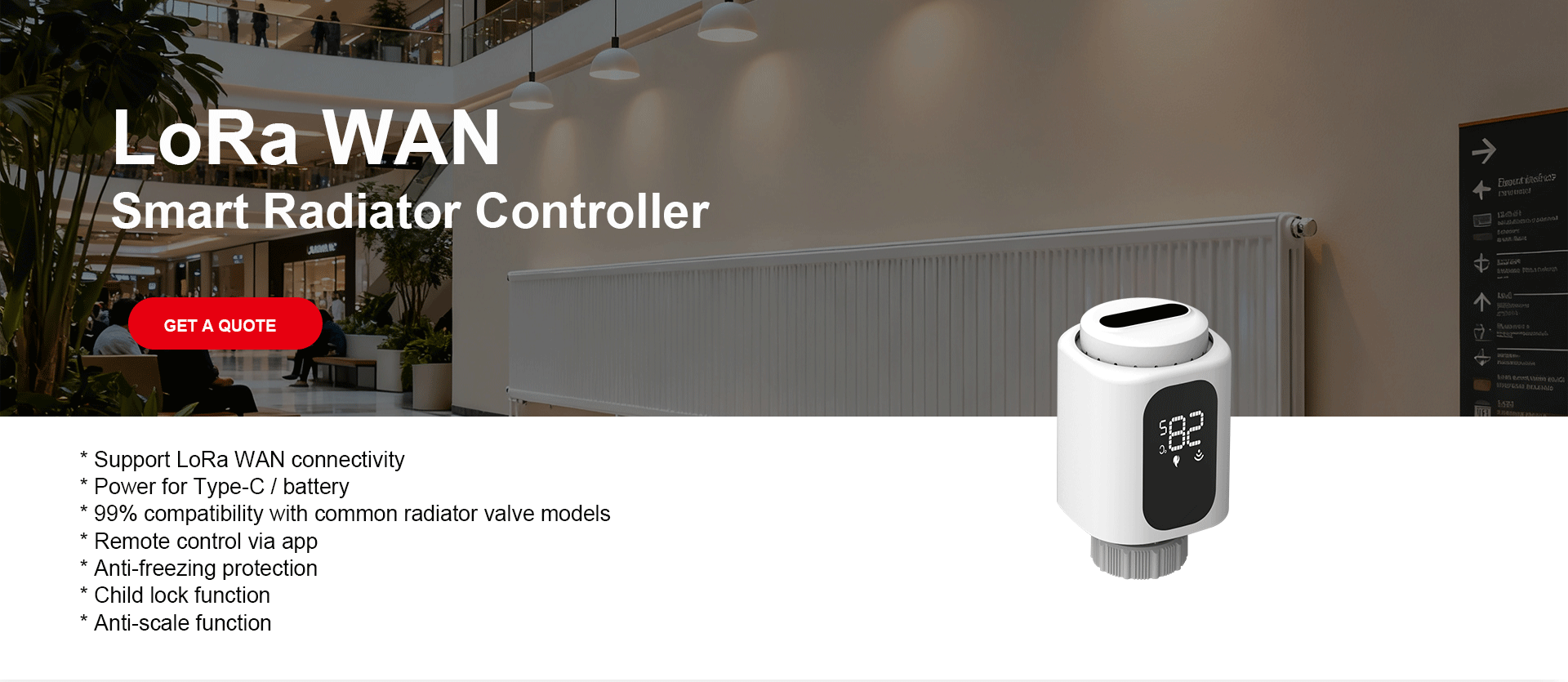 The LoRaWAN Smart Radiator Controller is an intelligent heating control device that uses LoRaWAN technology for remote room temperature adjustment via mobile app or IoT platform. It supports both Type-C and battery power, and is compatible with 99% of radiator valve models.