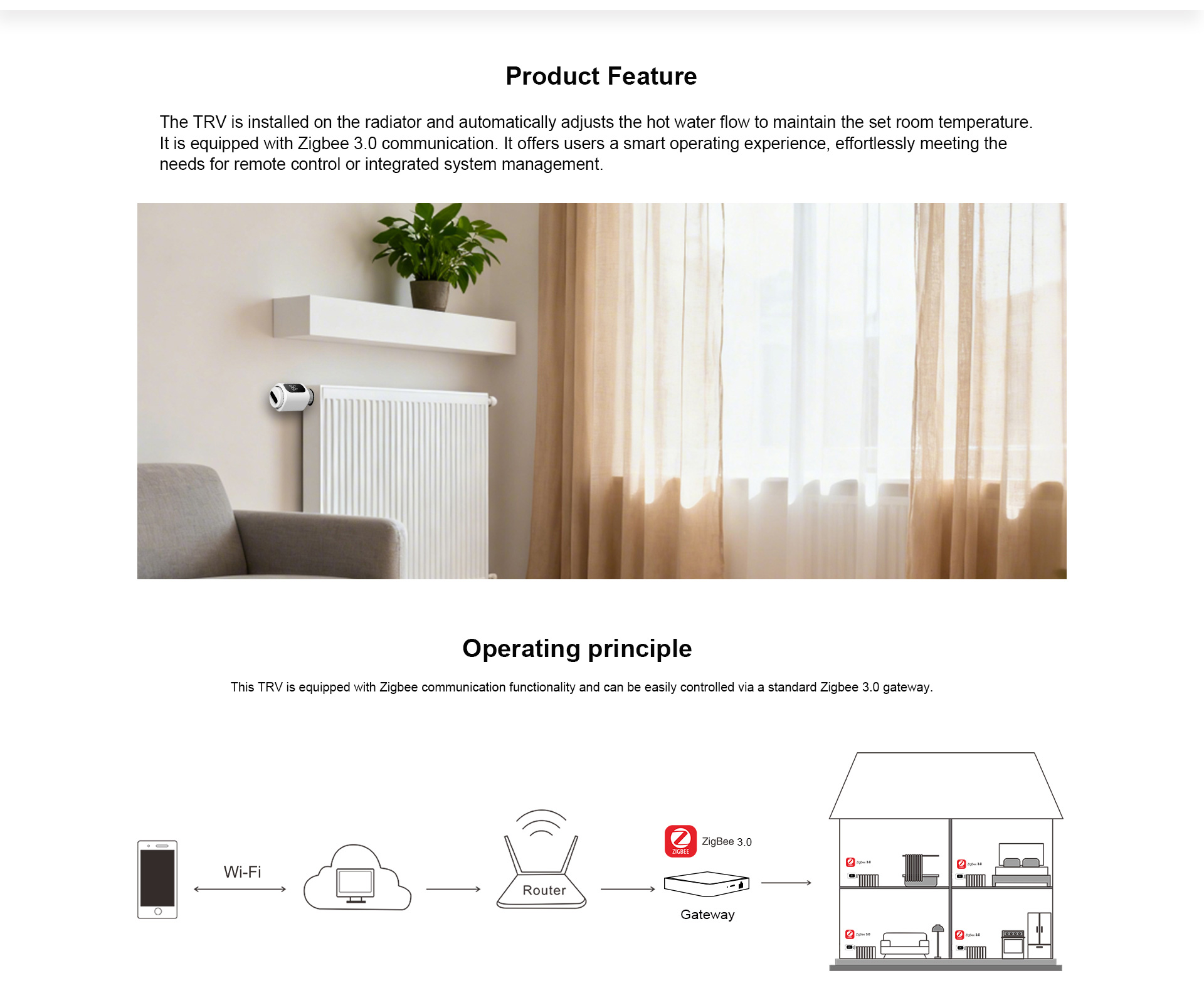 Zigbee 3.0 Smart Radiator Controller is an intelligent heating control device based on Zigbee 3.0 protocol. It connects seamlessly with smart home gateways and mobile apps, enabling remote temperature adjustment and energy-efficient heating management.